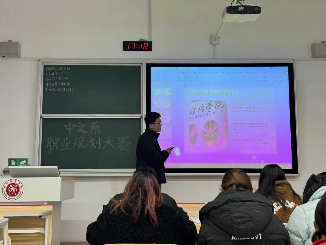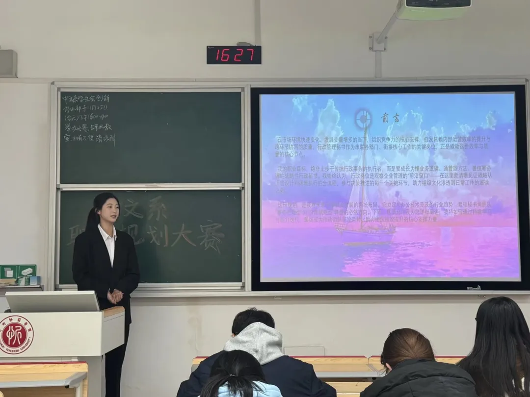 正式比赛中,十四位选手依次登台,结合精心制作的PPT,进行了限时职业规划阐述。他们的职业目标呈现出中文系毕业生宽广的就业光谱:有的立志成为深耕传统文化的中学语文教师,有的规划成为一名光荣的残疾儿童教师,有的渴望回到家乡成为一名语文老师,还有的希望为文献整理、博物馆宣传做出贡献。选手们不仅清晰地分析了自我认知兴趣、能力和外部环境,更制定了详尽且可行的短期、中期和长期行动计划,充分展现了中文系学子“腹有诗书气自华”的底蕴与“脚踏实地闯未来”的务实精神。