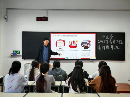 10月15日下午4:40,我系“青马工程”培训班第一课在崇文楼A409教室开讲,中文系老师杨智源为学员授课。