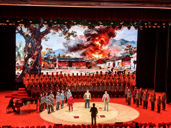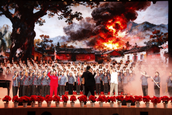 比赛现场,中文系合唱队员以“村民”形象沉浸式呈现表演:他们或紧握“农具”、目光如炬,或相互搀扶、传递信念,将肢体语言与歌声深度融合,把村民面对外敌时的愤慨之情与抗争决心展现得淋漓尽致,台下掌声与喝彩声此起彼伏,观众无不动容。随着和声层层递进,队员们更将《五子炮》中蕴含的民俗韵味与历史厚重感缓缓铺陈,让经典旋律焕发新的感染力。